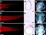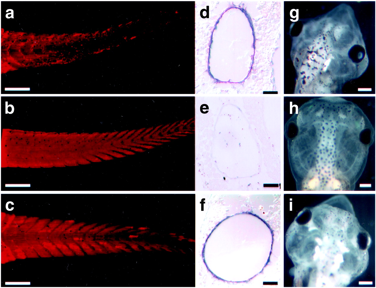Fig 2. Assaying muscle loss by using a muscle-specific antibody (MF20) after the 2-wk assay of tadpoles with TH. (a) Tail of an animal treated with 10 nM T3 for 7 days. Note the loss of muscle fibers and disorganization of the chevron structures. (b) Tail of an untreated animal. (c) Tail of a pCar/TRDNα transgenic animal treated with 10 nM T3 for 7 days. (dâf) In situ hybridization of tail cross sections obtained from animals in aâc, respectively, with collagenase-3 antisense probe. (gâi) Changes in the head of the animals in aâc, respectively, after the 2-wk assay. [Bars = 500 μm (aâc and gâi), 100 μm (d and e), and 50 μm (f).]