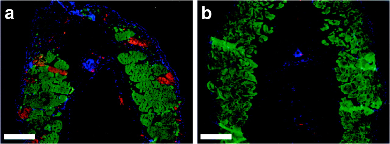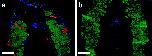 Fig 4. Inhibition of activation of caspase-3 in tailmuscle during spontaneous metamorphosis. (a) Cross section through the mid tail region of a wild-type tadpole at NF stage 62 stained with active caspase-3 antibody (red) and MF20 (green) and counterstained with 4â²,6-diamidino-2-phenylindole (DAPI; blue). (b) Similarly stained cross section through the mid-tail region of a pCar/TRDNα tadpole. (Bars = 100 μm.)