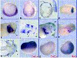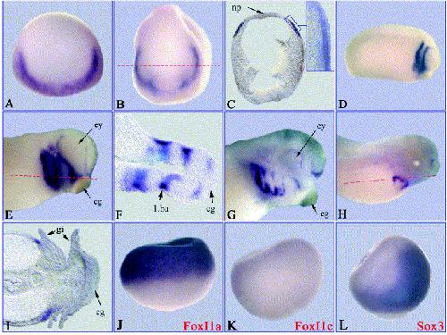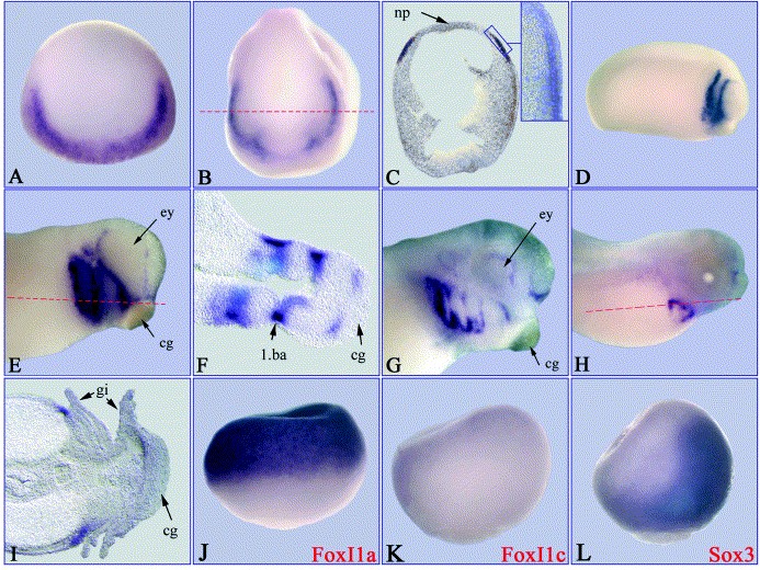 Fig. 4. Spatial expression of xFoxI1c. The spatial pattern of xFoxI1c expression was determined by whole mount in situ hybridisation and compared to the early expression patterns of FoxI1a/b and Sox3. (A) Stage 14; (B) stage 17; (C) horizontal section of B, the insert shows part of the epidermal layer stained with DAPI to show the nuclei; (D) stage 22; (E) stage 28; (F) horizontal section of E; (G) stage 32, (H) stage 41; (I) horizontal section of H. Embryos in A and B are shown in anterior view, DâH are lateral view, plane of sections are marked by red lines. J, K and L show stage 11 embryos hybridised with probes as indicated; all are orientated with dorsal side to the right and the animal half to the top. np, neural plate; 1.ba, first branchial arch; cg, cement gland; ey, eye; gi, gills; np, neural plate.