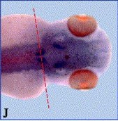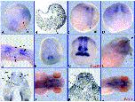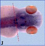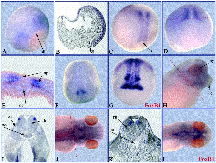Fig. 3. Spatial expression of xFoxB2. Whole mount in situ hybridisation was performed with xFoxB2 and xFoxB1 (G, L) antisense probes and embryos at different developmental stages. (A) Stage 11; (B) parasagittal section of A; (C) stage 12; (D) stage 14; (E) transversal section of D, nuclei stained with DAPI; (F) stage 15; (G) FoxB1 (Fkh-5), stage 16; (H) stage 35; (I) horizontal section of H; (J) stage 41; (K) horizontal section of J; (L) FoxB1, stage 41. Embryos shown in (AâC) are orientated with dorsal side to the right and animal half to the top; D, F, G anterior view; H shows a lateral and J as well as L a dorsal view. The plane of sections is marked by red lines. cg, cement gland; dl, dorsal lip; ey, eye; np, neural plate; no, notochord; ov, otic vesicle; rh, rhombencephalon.