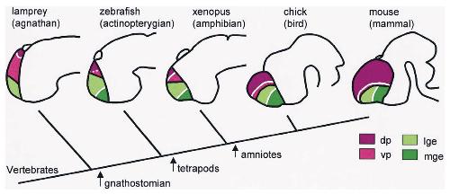 vertebrate lineage. For each species a schematic brain is drawn with pallial (purple) and subpallial (green) telencephalic divisions. The brain drawings are