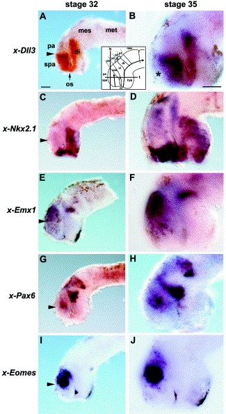Fig.1. In toto analysis of x-Dll3, x-Nkx2.1, x-Emx1, x-Pax6 and x-Eomes expression in Xenopus brain. Whole-mount dissected brains at stage 32 (left column, entire brain) and stage 35 (right column, focused on the forebrain) are photographed in lateral views. In all panels, anterior is left and dorsal is up. The arrowhead in (A,C,E,G,I) indicates the position of the psb between the pallium (pa) and the subpallium (spa). The asterisk in (B) points to the x-Dll3 negative area in the rostral forebrain, see text. The inset indicates the plan of sections for transverse (t) and horizontal (h) sections in the next figures, as deduced from the axis of the brain. This antero-posterior axis is indicated by black arrows. Therefore, in the telencephalon, a horizontal section is parallel to the axis and allows the visualisation of transverse boundaries and divisions. Abbreviations are in Table 1. Scale BAR=100 μm.