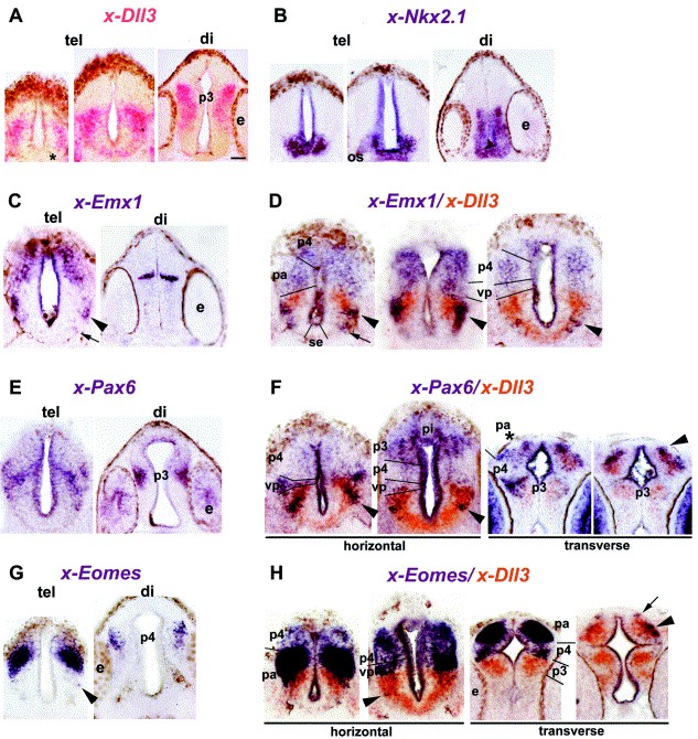 Fig. 2. Analysis on sections of x-Dll3, x-Nkx2.1, x-Emx1, x-Pax6 and x-Eomes expression at stage 32 and 35. (AâC,E,G) Single labelling and (D,F,H) double-labelling for the indicated genes. The gene names are colour-coded to indicate the pink, orange or purple reaction associated to the probe. All panels show horizontal sections (presented from rostral to caudal) and/or transverse sections (presented from dorsal to ventral). Asterisk in (A) indicates the x-Dll3 negative area surrounded by the subpallium (same as Fig. 1, panel B), discussed in text as the rostral pallium. In all panels, arrowheads indicate the presence of pallial markers expressed in a subpallial (x-Dll3 expressing) location, discussed in text as being the striatum. In all panels, arrows indicate pallial markers expressed in the rostral pallium, discussed in text as being the olfactory bulb. Asterisk in (F) (transverse section) shows the absence of x-Pax6 expression in the MZ of a subregion of the pallium, discussed in text as the DP. The results are pooled from stage 32 (A,B,D,E,G and Hhorizontal) and 35 (C,F and Htransverse) embryos. Note that there is no strict correspondence between the antero-posterior/dorso-ventral levels shown in the different panels. See Table 1 for abbreviations. Scale BAR=100 μm.