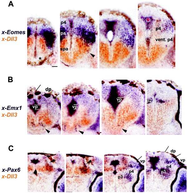 Fig. 3. Relative expression of x-Dll3, x-Emx1, x-Pax6 and x-Eomes at stage 40. Expression of pallial markers (blue) relative to x-Dll3 (orange) on horizontal (A,B) and transverse (C) sections through the forebrain of stage 40 embryos. Horizontal sections and transverse sections are presented in a rostro-caudal and dorso-ventral order, respectively. Asterisk in (A) indicates the x-Dll3 negative area surrounded by the subpallium (same as Fig.1 and Fig. 2). In all panels, arrowheads indicate the presence of pallial markers expressed in a subpallial (x-Dll3 expressing) location. See Table 1 for abbreviations. Scale BAR=100 μm.