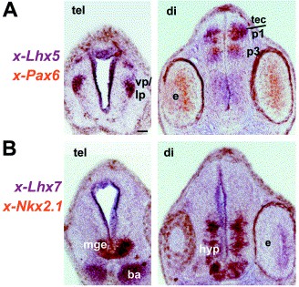 Fig. 4. Co-expression of Xenopus regionalisation genes and LIM-hd genes in the same forebrain subdivisions. Horizontal sections through the telencephalon and the diencephalon of stage 32 embryos double labelled for x-Pax6 and x-Lhx5 (A) and x-Nkx2.1 and x-Lhx7 (B). For example, x-Nkx2.1 and x-Lhx7 are co-localised in the mge and hypothalamus but not in branchial arches (ba). tec, tectum. See Table 1 for abbreviations. Scale BAR=100 μm.