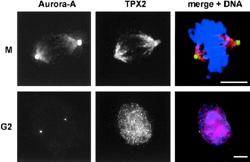 Figure 3. TPX2 and Aurora-A colocalize on the spindle. Indirect immunofluorescence micrographs of HeLa S3 cells stained for Aurora-A (left) and TPX2 (middle). A merge of the two images together with DAPI staining of DNA is shown in the right panel. The top row shows a representative metaphase cell; the bottom row shows a representative G2 phase cell. Bars, 10 μm.