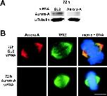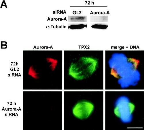 Figure 4. TPX2 localization is independent of Aurora-A. (A) Western blot analysis of total extracts from HeLa cells treated for 72 h with a siRNA duplex targeting Aurora-A or a control duplex (GL2). Filters were probed for Aurora-A and α-tubulin as a loading control. (B) HeLa S3 cells were treated for 72 h with an Aurora-A–specific siRNA duplex (top row) or a control duplex (GL2; bottom row) and then fixed and stained with antibodies against Aurora-A (left) and TPX2 (middle). A merge of the two images together with DAPI staining of DNA is shown on the right. Bar, 10 μm.