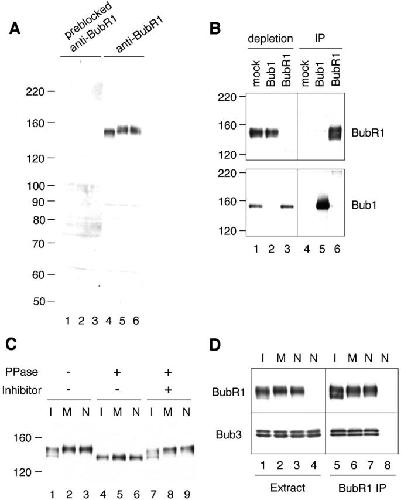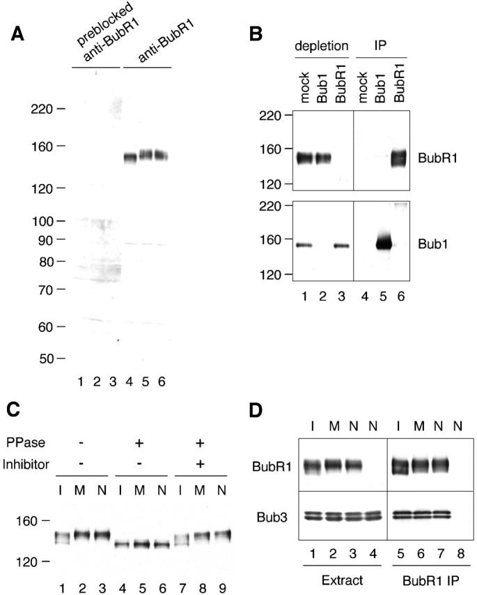 Figure 1. BubR1 is a phosphoprotein associated with Bub3. (A) Specificity of the anti-BubR1 antibody. Interphase (lanes 1 and 4), metaphase (lanes 2 and 5), or spindle checkpoint–active (lanes 3 and 6) extracts were immunoblotted with anti-BubR1 antibody (lanes 4–6) or the same antibody preincubated with recombinant BubR1 protein (lanes 1–3). The migration of molecular standards is indicated on the left. (B) Anti-BubR1 antibody recognizes BubR1, but not Bub1. Immunoprecipitation was performed from metaphase extracts with a control IgG (lanes 1 and 4), anti-Bub1 (lanes 2 and 5), or anti-BubR1 (lanes 3 and 6) antibody. The supernatants left after immunoprecipitation (lanes 1–3) or the immunoprecipitates (lanes 4–6) were probed with anti-BubR1 (top) or anti-Bub1 (bottom) antibody. The migration of molecular standards is indicated on the left. (C) BubR1 is a phosphoprotein. Interphase (I; lanes 1, 4, and 7), metaphase (M; lanes 2, 5, and 8), and spindle checkpoint–active (N; lanes 3, 6, and 9) extracts were treated with phosphatase buffer (lanes 1–3), LPP (lanes 4–6), or LPP and phosphatase inhibitors (lanes 7–9). The extracts were then immunoblotted with anti-BubR1 antibody. The migration of molecular standards is indicated on the left. (D) BubR1 associates with Bub3. Anti-BubR1 immunoprecipitates were prepared from interphase (lanes 1 and 5), metaphase (lanes 2 and 6), or spindle checkpoint–active (lanes 3 and 7) extracts, or from Bub1-depleted extract with the spindle checkpoint provoked (lanes 4 and 8). The extracts (lanes 1–4) or the immunoprecipitates (lanes 5–8) were immunoblotted with anti-BubR1 (top) or anti-Bub3 (bottom) antibody. |