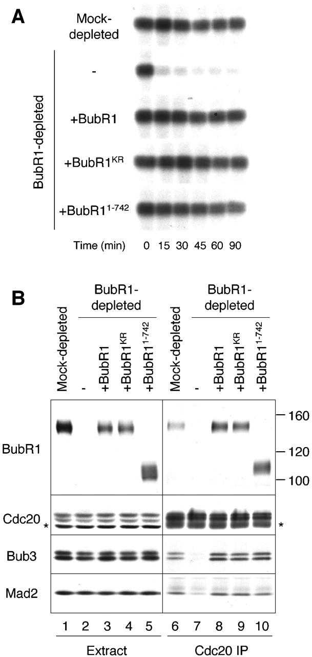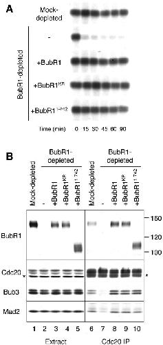 Figure 5. BubR1 is required for spindle checkpoint independently of its kinase activity. (A) Autoradiographs of histone H1 kinase assay. Extracts were depleted with a control IgG (mock depleted), or with anti-BubR1 antibody, and then supplemented with mock, wild-type BubR1, BubR1KR, or BubR11–742 as indicated on the left. The level of BubR1 protein in extracts was similar to that shown in B (lanes 1–5). After incubation with nuclei and nocodazole, calcium was added to the extracts to inactivate CSF activity and to trigger mitotic exit. Samples were taken immediately before calcium addition (time = 0) or every 15 min thereafter as indicated on bottom. (B) Extracts were depleted with a control IgG (lanes 1 and 6) or anti-BubR1 antibody and then supplemented with mock (lanes 2 and 7), wild-type BubR1 (lanes 3 and 8), BubR1KR (lanes 4 and 9), or BubR11–742 (lanes 5 and 10). The spindle checkpoint was induced in these extracts by incubation with nuclei and nocodazole, followed by anti-Cdc20 immunoprecipitation. The extracts (lanes 1–5) or the immunoprecipitates (lanes 6–10) were immunoblotted for proteins indicated on the left. Asterisks indicate a cross-reacting protein and IgG heavy chain on the left and right panels, respectively. |
