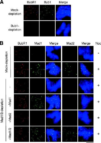 Figure 6. Localization of BubR1 to kinetochores is dependent on Bub1 and Mad1. (A) Bub1 is required for BubR1 to associate with kinetochores. Mitotic chromosomes were isolated from mock- or Bub1-depleted extracts in the presence of nocodazole and subjected to immunofluorescence staining for BubR1 and Bub1 as described for Fig. 3. The level of depletion is similar to that shown in Fig. 1 A. (B) Kinetochore association of BubR1 is reduced in the absence of Mad1. Extracts were mock depleted or depleted for both Mad1 and Mad2 (Mad1/2 depletion). The latter extracts were then supplemented with mock, Mad1, Mad2, or both Mad1 and Mad2 as indicated on the left. Mitotic chromosomes were assembled in these extracts lacking or containing nocodazole as indicated on the right. Chromosomes from each sample were isolated and loaded onto two coverslips. One set of the samples was stained for BubR1 and Mad1, the other for BubR1 and Mad2 as described for Fig. 3. For space conservation, BubR1 staining was shown for only one set of the samples. Bar, 10 μm. Immunoblot analysis of the extracts is similar to Fig. 7 (lanes 1–6). |