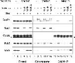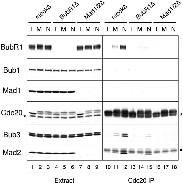 Figure 2. Mutual dependency between BubR1 and Mad2 in binding to Cdc20. CSF-arrested extracts were depleted with control IgG (mockΔ; lanes 1–3 and 10–12), anti-BubR1 (BubR1Δ; lanes 4–6 and 13–15), or anti-Mad2 (Mad1/2Δ; lanes 7–9 and 16–18) antibody. The extracts were induced to enter interphase (lanes 1, 4, 7, 10, 13, and 16), were kept at metaphase (lanes 2, 5, 8, 11, 14, and 17), or were incubated with nuclei and nocodazole to activate the spindle checkpoint (lanes 3, 6, 9, 12, 15, and 18). Anti-Cdc20 immunoprecipitates were prepared from these extracts. The extracts (lanes 1–9) or immunoprecipitates (lanes 10–18) were immunoblotted for the proteins indicated on the left. The asterisks indicate a cross-reacting protein and IgG heavy chain on the left and right panels of Cdc20 blots, respectively. The asterisk on the right of Mad2 blot indicates IgG light chain that migrates right above Mad2. Immunodepletion with anti-Mad2 antibody removes both Mad1 and Mad2. |