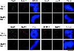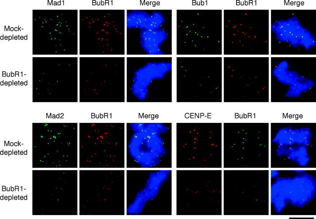 Figure 3. BubR1 is required for kinetochore binding of Mad1, Mad2, Bub1, and CENP-E. Mitotic chromosomes were isolated from mock- or BubR1- depleted extracts treated with nocodazole and then incubated with rabbit antibodies against Mad1, Mad2, or Bub1, as indicated on top, followed by fluorescein-conjugated anti–rabbit antibody. BubR1 was then detected with biotinylated anti-BubR1 antibody and Texas red– conjugated streptavidin. For double staining of CENP-E and BubR1, rabbit antibody against BubR1 was used, followed by fluorescein-conjugated anti–rabbit antibody. CENP-E was then detected with biotinylated anti–CENP-E antibody and Texas red–conjugated streptavidin. Chromosomes were stained with Hoechst 33258. The merge pictures contain all three fluorochromes. All images of the same fluorochrome were taken for the same exposure time and processed in the same way. Bar, 10 μm. |