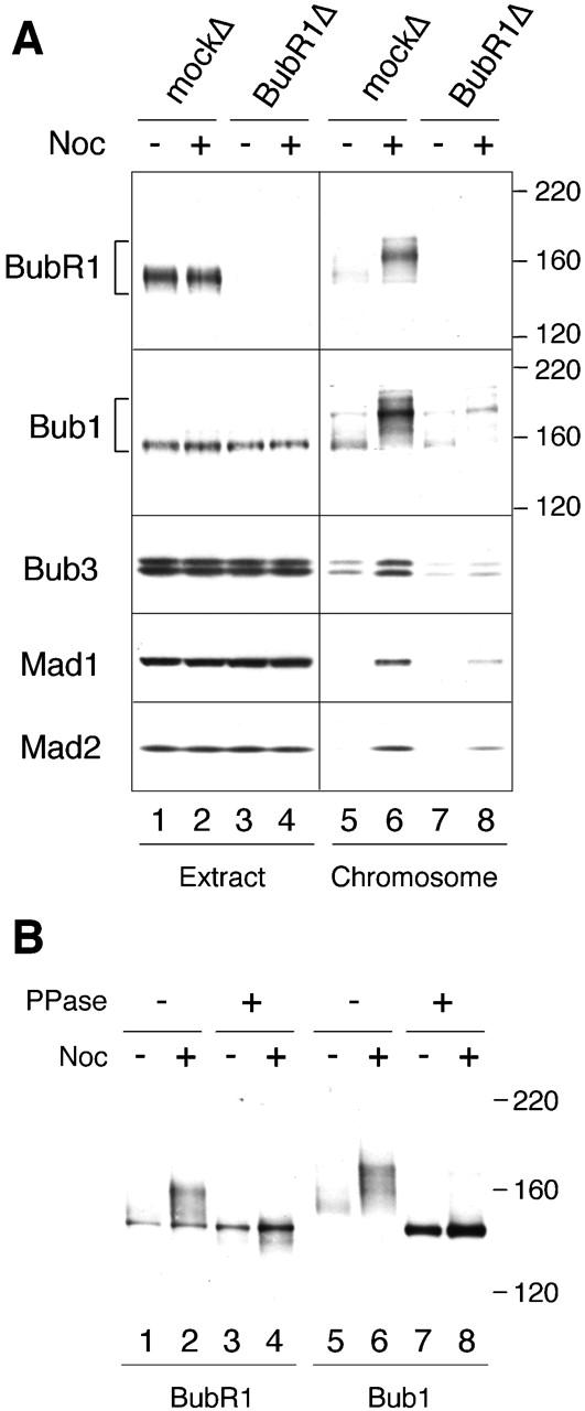 Figure 4. BubR1 is required for other spindle checkpoint proteins to associate with chromosomes. (A) Immunoblot analysis of various checkpoint proteins associated with chromosomes. Mitotic chromosomes were isolated from mock-depleted (lanes 1, 2, 5, and 6) or BubR1-depleted (lanes 3, 4, 7, and 8) extracts that were untreated (lanes 1, 3, 5, and 7) or treated with nocodazole (lanes 2, 4, 6, and 8). The extracts or chromosomal fractions were immunoblotted for proteins indicated on the left. The migration of molecular size standards is indicated on the right for BubR1 and Bub1 blots. (B) Phosphatase treatment removes mobility shift of chromosomal BubR1 and Bub1. Chromosomal pellets prepared from untreated extracts (lanes 1, 3, 5, and 7) or extracts treated with nocodazole (lanes 2, 4, 6, and 8) were treated with phosphatase buffer (lanes 1, 2, 5, and 6) or LPP (lanes 3, 4, 7, and 8). The samples were then immunoblotted for BubR1 (lanes 1–4) or Bub1 (lanes 5–8). The migration of molecular size standards is indicated on the right. |