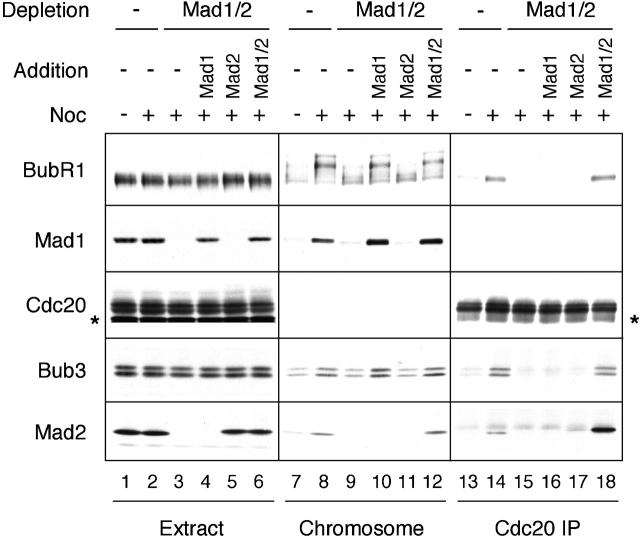 Figure 7. Hyperphosphorylation of chromosomal BubR1 requires Mad1. Mock-depleted extracts or extracts lacking Mad1 and/or Mad2 were prepared as described for Fig. 6 B (lanes 1–6). The extracts were incubated with nuclei (15,000 nuclei/μl extract) in the absence or presence of nocodazole as indicated on top. The samples were then subjected to chromosome isolation or immunoprecipitation with anti-Cdc20 antibody. The extracts (lanes 1–6), chromosomal fractions (lanes 7–12), and Cdc20 immunoprecipitates (lanes 13–18) were immunoblotted for proteins indicated on the left. The band above Mad2 in lanes 13–18 is the IgG light chain. The blots for Mad1 in Cdc20 immunoprecipitates and for Cdc20 in the chromosomal fractions are not shown, because of a lack of specific association. Exogenously added Mad1 and Mad2 tend to nonspecifically associate with Cdc20 immunoprecipitates, resulting in the high level of Mad2 in lane 18. |