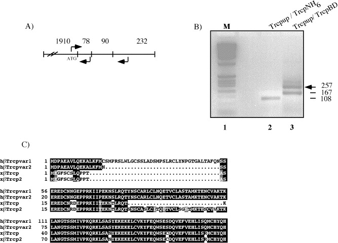 Fig. 1. NH2 isoforms of βTrCP. (A) The diagram represents the first four exons of βTrCP and their sizes, indicated as base pairs. The location of the “sense” primer is indicated by a bent arrow above the diagram. The “antisense” primers are denoted by bent arrows below the diagram. (B) Electrophoretic profile of RT-PCR amplification products obtained starting from X. laevis oocyte mRNAs and using, as primers, the oligonucleotide pair specific to exons I and II (lane 2) and the oligonucleotide pair specific to exon I and IV (lane 3) primer sets are depicted at the top of each lane. M in lane 1, the size marker, is 1 kb ladder. DNA band sizes, expressed in base pair and determined by DNA sequencing, are shown on the right side of the panel. The arrowhead points to the DNA band containing the 90 nt insertion coding for additional 30 amino acids. (C) Alignment of the human βTrCP variant 1 and 2 amino acid sequences with Xenopus βTrCP/pF112 (17), and βTrCP isoform 2. The sequence in the figure is limited to the NH2 region of βTrCP. Positions with amino acid identities are shown as black boxes. Positions with conservative changes are shown in shaded boxes.