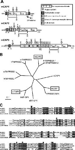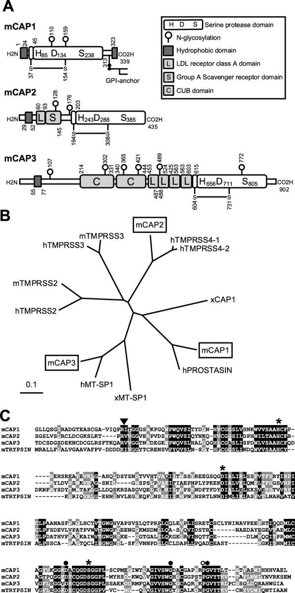 Figure 1. . mCAP1, 2, and 3 are membrane-bound serine proteases. (A) Structural properties of the three mCAPs (mCAP1, mCAP2, and mCAP3). The amino acid sequence of each protein was scanned using ProfileScan algorithm to confirm the presence of domains indicated. Numbers delineate the location of each domain. (B) A representative phylogenetic tree of the GPI-anchored mCAP1 and type II transmembrane mCAP2 and mCAP3 serine protease family proteins. Multiple alignment was generated by the clustal W program (mCAP1, AAG1705; hProstasin, Q16651; xCAP1, AAB969054; mCAP2, AY043240; hTMPRSS4-1, CAC60389; hTMPRSS4–2; MT-SP2, Q9NRS4; mTMPRSS2; epitheliasin, AAF97867; hTMPRSS2, AAC51784; mTMPRSS3, CAC83350; hTMPRSS3, P57727; mCAP3; epithin, AAD02230; hMT-SP1, AAF00109; xMT-SP1, BAB08218). (C) Amino acid alignment of the serine protease catalytic domain of mCAP1, mCAP2, and mCAP3 with mouse trypsinogen precursor (1–246), was performed using Pileup program (Genetic Computer Group). Gray and black boxes indicate similar and identical residues, respectively. The catalytic triad (H, D, and S, asterisks), the amino acids implicated in the P1 substrate specificity (closed circle), and the position for Na+ sensibility (open circle) are indicated.