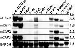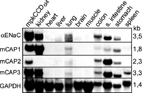 Figure 2. . Coexpression of all three serine proteases with ENaC. Multiple tissue Northern blot containing 20 μg of RNA/lane were hybridized with cDNA fragments of the rat αENaC, mouse CAP1, CAP2, CAP3, and GAPDH genes, as described in materials and methods. mRNA transcript lengths are indicated.