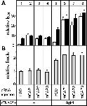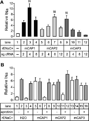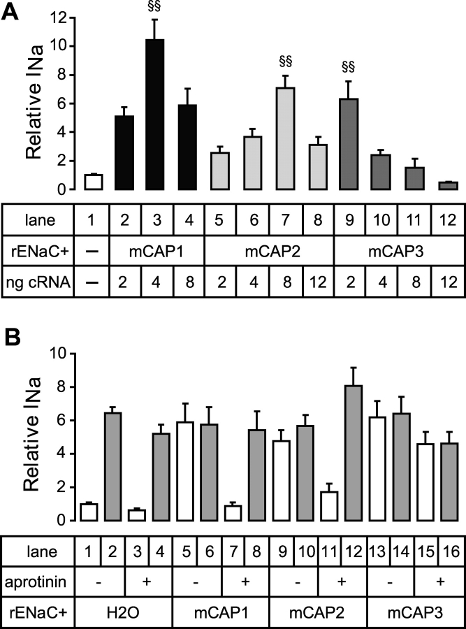 Figure 3. . Functional analysis of mCAP1–3 in Xenopus oocytes. (A) Comparison of the effect of mCAP1, mCAP2, and mCAP3 on INa in Xenopus oocytes. Oocytes were injected with rat ENaC subunits in the presence of either water (open bar, lane 1) or increasing amounts (2, 4, and 8 or 12 ng) of mCAP1 (closed bar, lanes 2–4), mCAP2 (light gray bar, lanes 5–8), or mCAP3 (dark gray bars, lanes 9–12). §§, P < 0.01 versus conditions with other amounts of the same cRNA protease. n ≥ 12 measured oocytes. (B) Effect of preincubation with aprotinin (lanes 3, 4, 7, 8, 11, 12, 15, 16) or perfusion of trypsin (gray bars, lanes 2, 4, 6, 8, 10, 12, 14, 16) on oocytes injected with either rENaC and water (lane 1–4) or rENaC together with 4 ng mCAP1 (lane 5–8), 8 ng mCAP2 (lane 9–12), and 2 ng mCAP3 (lane 13–16). n ≥ 12 measured oocytes.
