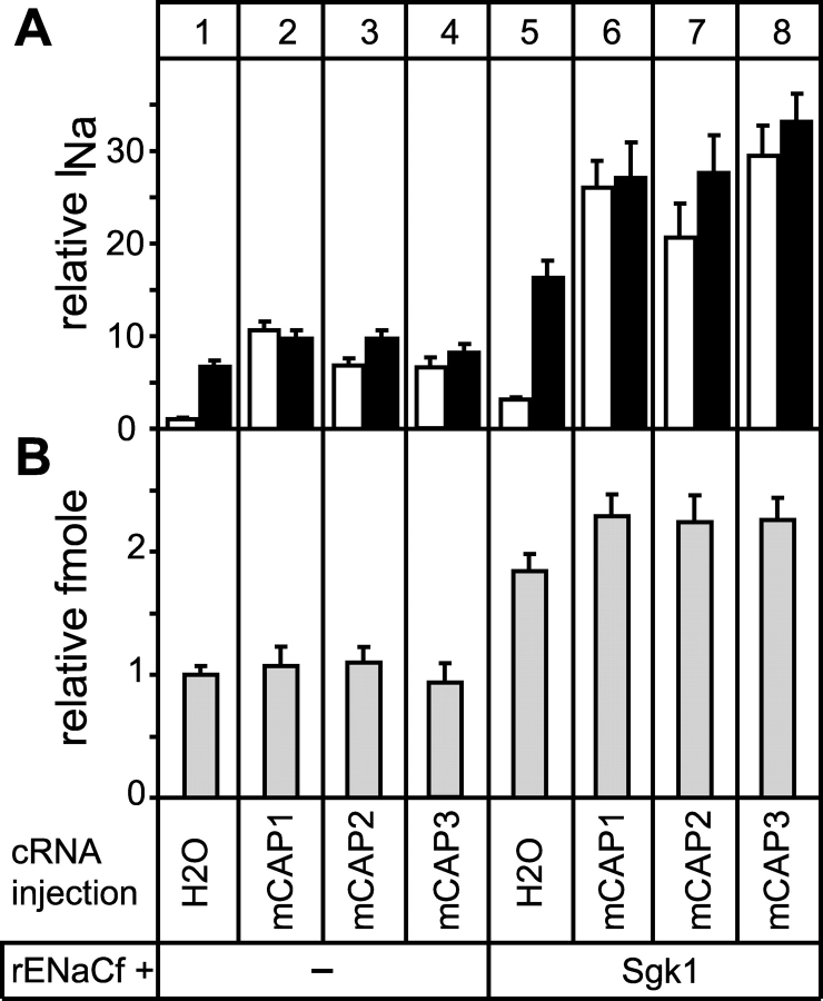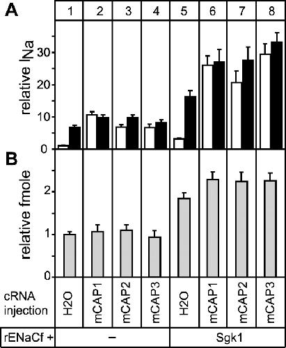 Figure 4. . Synergistic activation of mCAP1–3 and Sgk1 on ENaC activity. (A) Oocytes were injected with cRNA coding either for α, β, and γFLAG-tagged rENaC subunits (rENaCf) and water (lane 1) or rENaCf together with mCAP1 (lane 2), mCAP2 (lane 3), mCAP3 (lane 4), Sgk1 (lanes 5–8), or both Sgk1 and mCAP1 (lane 6), Sgk1 and mCAP2 (lane 7), and Sgk1 and mCAP3 (lane 8). INa was measured in absence (open bar) and after perfusion of trypsin (closed bar) and normalized to INa in oocytes injected with rENaC alone. n ≥ 15 measured oocytes per experimental condition taken from Tables I–III. (B) Normalized oocyte cell surface expression of rENaCf in oocytes experiments described in A. Water, lane 1; mCAP1, lane 2; mCAP2, lane 3; mCAP3, lane 4; Sgk1, lane 5; mCAP1 + Sgk1, lane 6; mCAP2 + Sgk1, lane 7; mCAP3 + Sgk1, lane 8. ***, P < 0.001 versus rENaCf + water.