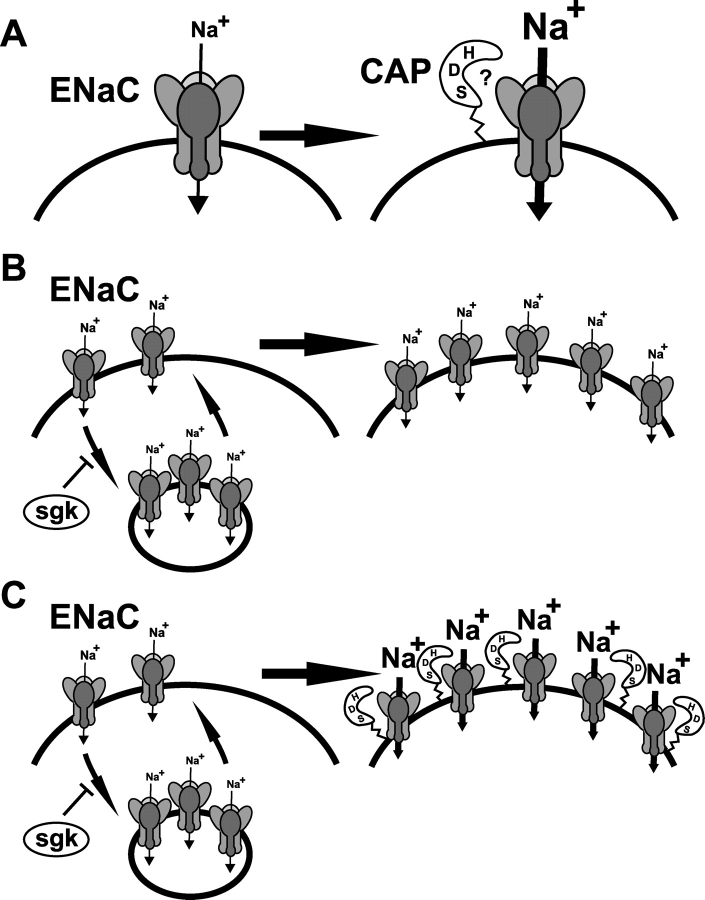 Figure 5. . Model of CAPs and Sgk1 action on ENaC. (A) CAPs increase the open probability of ENaC channels. The substrate of CAPs may be ENaC or protein(s) associated with ENaC. (B) Model of Sgk1 action on ENaC. Sgk1 principally increases the number of active channels at the cell surface by diminishing the removal of the channels from the cell surface and by increasing its Po. (C) CAPs proteases and Sgk1 act synergically on the channel open probability and cell surface expression.