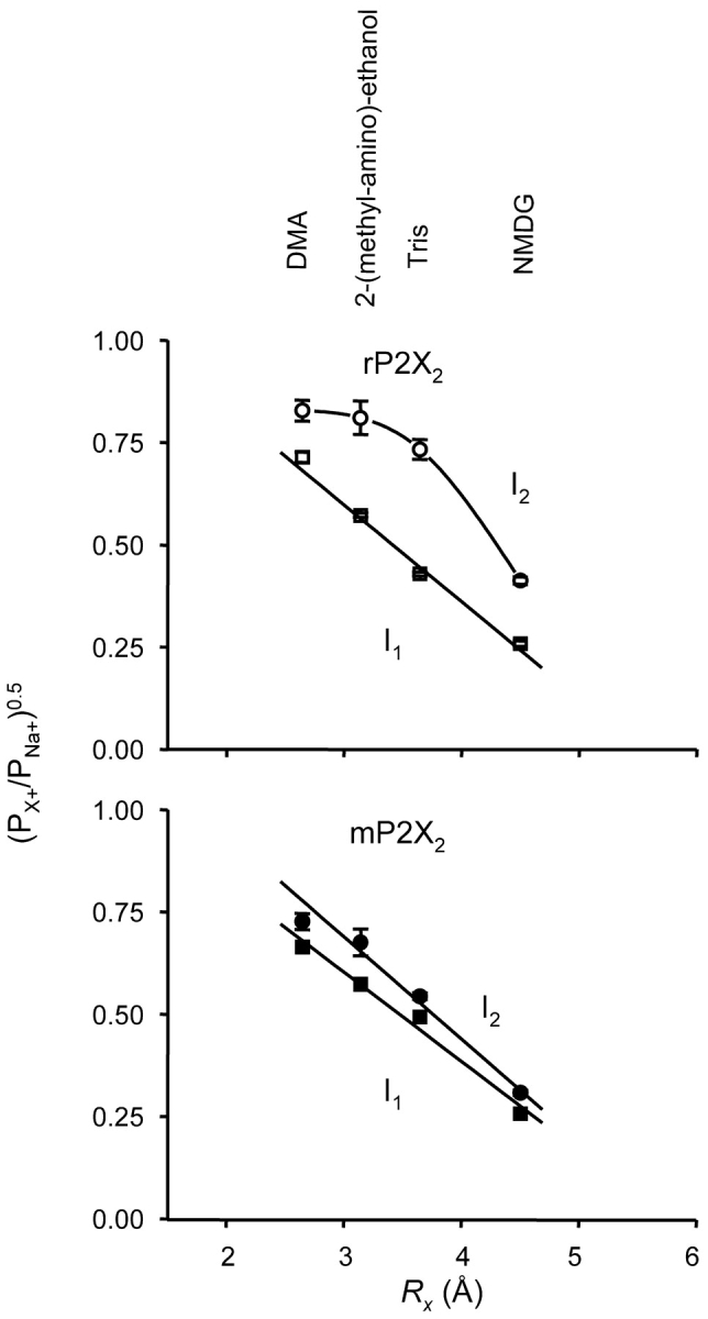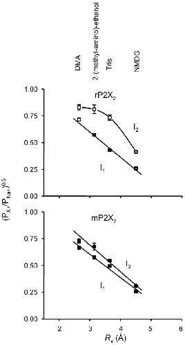 Figure 4. . Pore sizes determined using EFT. Top and bottom panels show graphs used to determine the narrowest part of the channel pore for rP2X2 and mP2X2 channels, respectively, in I1 (within 1s of applying ATP) and I2 states (up to 30 s after applying ATP). The lines are linear regressions except for rP2X2 I2, which is a cubic spline. Please refer to materials and methods for details of the pore size calculations. The ions (Rx = radius; see materials and methods) in order of increasing size are: dimethylammonium (2.7 Å), 2-(methyl-amino)-ethanol (3.1 Å), Tris+ (3.7 Å), and NMDG+ (4.5 Å), and their mobilities in free solution are 51.8, 33.4, 29.4, 24.3, and 50.1 10−4m2S mol−1, for dimethylammonium, 2-(methyl-amino)-ethanol, Tris+, NMDG+, and Na+. |