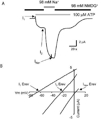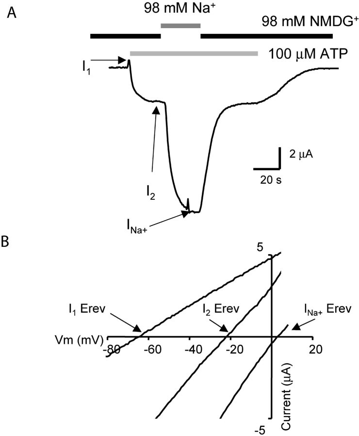 Figure 1. . Properties of permeability changes at rP2X2 channels. (A) Representative current waveform from a voltage-clamped oocyte (−60 mV). The cell was bathed in an NMDG+-containing extracellular solution and then at the indicated time ATP was applied, first with NMDG+ and then with Na+ in the extracellular solution. The record illustrates the three current phases, I1, I2, and INa+, the statistics for which are presented in Table I. (B) I-V relations determined at the peak of I1, I2, and at INa+: note that the reversal potentials differ. The ATP-evoked current reversal potential does not shift over time in extracellular solutions that contain only Na+ (Khakh et al., 1999). |