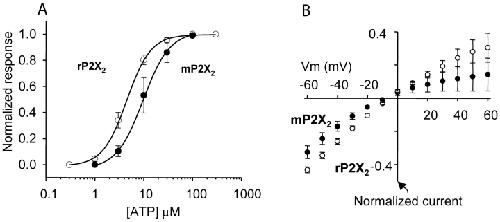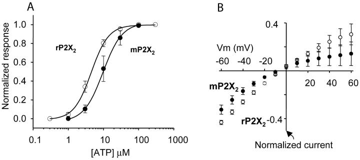 Figure 2. . Basic properties of rP2X2 and mP2X2 channels. (A) Concentration-effect curves for ATP at rP2X2 and mP2X2. There is a significant difference in EC50. (B) I-V relations from voltage steps (−60 to 60 mV in 10-mV steps) for mP2X2 and rP2X2. Note that rectification is approximately equal for both channels, but that there is greater variability in the data for outward currents as compared with inward current. A similar trend for natively and heterologously expressed channels has been reported previously (Khakh et al., 1995; Evans et al., 1996). In this and all other figures the error bars are omitted when they are smaller than the symbols used. |