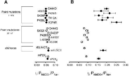Figure 6. . No single amino acid residue in the COOH-terminal domain accounts for the differences between mP2X2 and rP2X2 channels. The scatter graphs show data for wt mP2X2, rP2X2, mEL/rCT, rEL/mCT, and 14 single point mutant channels: (A) I1 PNMDG+/PNa+ and (B) I2 PNMDG+/PNa+. ATP-evoked currents for all mutants, chimeric, and wild-type channels were similar in amplitude for recordings in Na+ solutions, indicating approximately equivalent membrane expression. |