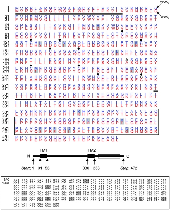 Figure 5. . Comparison of rP2X2 and mP2X2 sequences. The top panel shows an alignment for the entire rP2X2 and mP2X2 protein sequences (black lines are above predicted transmembrane domains and the black dots indicate the conserved cysteine residues), whereas the middle panel shows a representation of P2X subunit topology. The bottom panel shows an alignment of the mP2X2 cDNA used in this study, and the corresponding sequence of the mP2X2 gene. The codons for the amino acids that differ between mP2X2 and rP2X2 are shown in gray. Note that the genomic sequence agrees with the cDNA sequence in each case, assuring that the mP2X2 cDNA contains no PCR errors. The boxed regions correspond to identical sequence. |