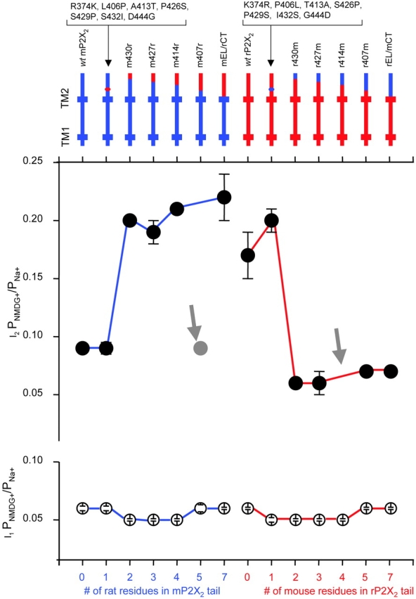 Figure 7. . Identification of C tail domain residues that govern permeability changes in the P2X2 channel. The top panel illustrates the location of P2X2 channel mutants, and chimeras with respect to the two TM domains. The bottom panel shows PNMDG+/PNa+ for the I2 and I1 states. Note that I1 PNMDG+/PNa+ is constant for all channels, but I2 PNMDG+/PNa+ varies depending on the composition of the C tail domain. Thus rP2X2 channels undergo large changes between I1 and I2, whereas mP2X2 channels do not. The differences can be reversed by transplanting the C tail domains (mEL/rCT and rEL/mCT) and by making chimeras that include the two most COOH-terminal rP2X2 residues of the seven that differ in this domain (see Fig. 5). The gray arrows point to uninformative or outlier constructs. |