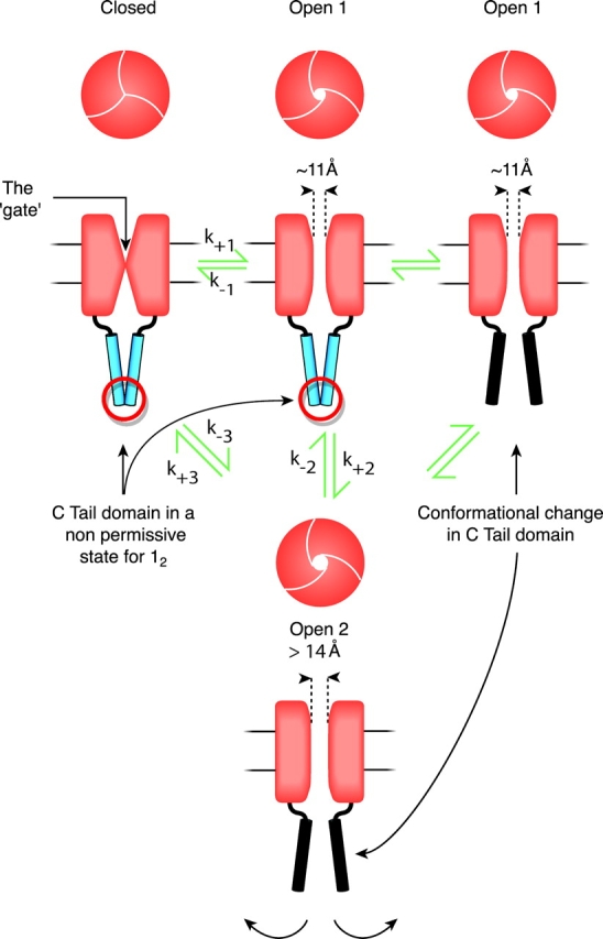 Figure 9. . A summary of rP2X2 permeability changes. The cartoon shows rP2X2 channels in closed and open states of differing diameter across the narrowest region. The narrowest region is shown as the gate. In the Closed and Open 1 state the C tail domain is diagrammatically shown as in a “nonpermissive state” with respect to permeability changes. The present paper shows that a conformational change occurs in the tail as, or before, the pore dilates, and this is hypothetically shown as a motion of the C tail domain away from the inner aspect of the channel, as in MscL channel gating (Sukharev et al., 2001). The model implies the existence of a state where the tail has undergone a conformation change but the pore has not yet dilated. A direct transition from Closed to Open 2 was demonstrated previously for mutant channels (Khakh et al., 1999; Virginio et al., 1999b). |