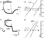 Figure 3. . rP2X2 and mP2X2 channels differ with respect to permeability changes. (A) rP2X2: steady-state current waveform (−60 mV) in NMDG+ extracellular solutions. ATP was applied when indicated and evoked an outward current that became inward over time. (B) Reversal potentials at the peak of I1 and I2 for rP2X2. (C) mP2X2: steady-state current waveform in NMDG+ extracellular solutions. ATP was applied for the period indicated and evoked an outward current that waned to a steady-state level. (D) Reversal potentials at the peak of I1 and I2 for mP2X2. |