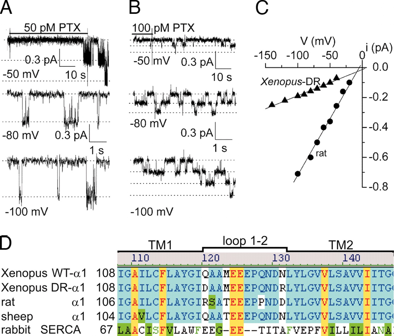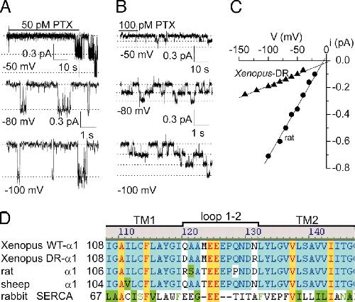 Different conductances of alternative ouabain-resistant PTX-bound pump-channels. (A and B) Currents at –50 mV in outside-out patches excised from oocytes expressing rat α1 (A) or Xenopus DR-α1 (B) Na/K pumps in symmetrical 125 mM Na solutions with 100 μM external ouabain but no pipette ATP, briefly exposed to PTX (50 pM in A and 100 pM in B) until the first channel opening was observed. Lower traces show gating transitions of PTX-bound pump-channels at indicated voltages after washout of unbound toxin; dotted lines mark 0, 1, 2, or 3 open channels. (C) Current amplitudes for channels in A (circles) and B (triangles) plotted against voltage; fits (straight lines) between –100 and –20 mV gave channel conductances γ = 7.5 pS for A and γ = 1.8 pS for B. (D) Sequence alignment of WT Xenopus α1, Xenopus DR-α1, rat α1, and sheep α1 Na,K-ATPases, and rabbit SERCA Ca-ATPase; all residues are numbered from Met 1. Loop 1-2 assignment is from cardiotonic steroid-binding studies (e.g., ref. 14), not later SERCA structures.