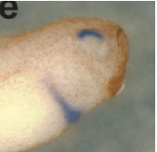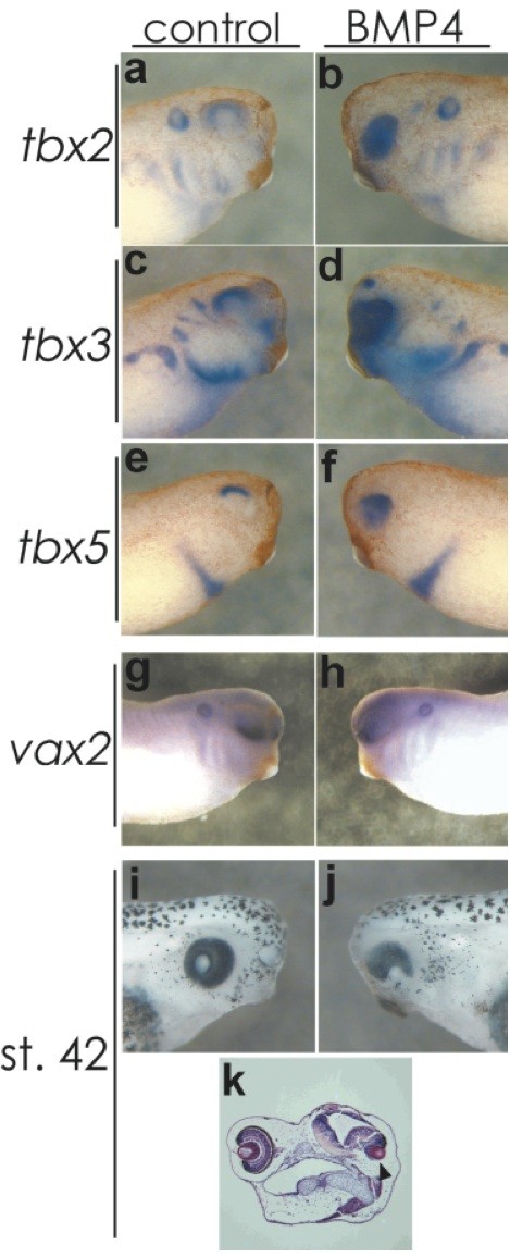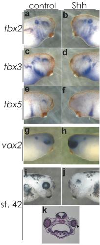 FIG. 3. Overexpression of Shh causes ventral specifications. Dorsal markers tbx2/3/5 disappeared (a). Expanding expres- sion of ventral marker vax2 reached almost the dorsal end of the optic vesicle (g, h). Although the eye became deformed and small by ectopic expression of Shh, a meager lens structure was confirmed in all embryos examined (ik). In situ hybridization was performed at stage 30. Right side in the same embryo: control. . Reproduced with permission of the Publisher, John Wiley & Sons.