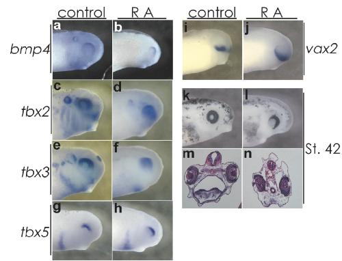 FIG. 6. RA had differential effects on D-V patterning of eye. Stage 16 embryos were treated with 1 M RA and cultured until stage 30 to perform in situ hybridization or stage 42 to verify the malformation of eye. Dorsal marker tbx2/3/5 (c) and bmp4 (a, b) were scarcely suppressed by RA, although the ventral expression borders expanded ventrally (c) and such expression more or less reoriented to the nasal side (ah). On the other hand, ventral marker vax2 was expanded dorsally (i, j). The choroids fissure of RA-treated embryo remained wide open (k, l) while the presence of the meager lens was confirmed (k). Reproduced with permission of the Publisher, John Wiley & Sons.