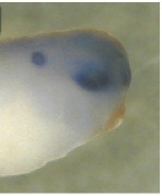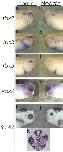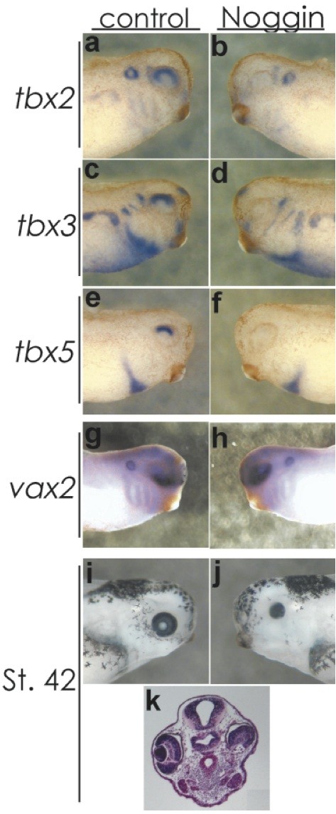 FIG. 2. Misexpression of Noggin represses dorsal fates. Dorsal markers tbx2/3/5 disappeared (a). Ventral marker vax2 expanded over the dorsal side (g, h). At stage 42 embryo, the choroid fissure was observed but no lens was detected (i). In situ hybridization was performed at stage 30. Right side in the same embryo: control. Reproduced with permission of the Publisher, John Wiley & Sons.