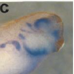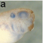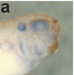 FIG. 7. The repressive effect of RA on shh and Shh-responsive genes, ptc1/2, was relatively weak or almost negligible in the forebrain (a: arrowhead), whereas RA treatment resulted in their strong repression in the caudal brain and anterior neural tube (a: arrow). In situ hybridization was performed at stage 30. Embryos were cleared by benzyl alcohol-benzyl benzoate. Reproduced with permission of the Publisher, John Wiley & Sons.