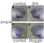 FIG. 5. bmp4 expression in the optic vesicle required both Shh and its own signal. Whereas Shh overexpression rather reinforced the expression of bmp4 (a, b), misexpression of Noggin, an antagonist of BMP, clearly repressed the expression of bmp4 (c, d). In situ hybridization was performed at stage 30. Right side in the same embryo: control. Reproduced with permission of the Publisher, John Wiley & Sons.