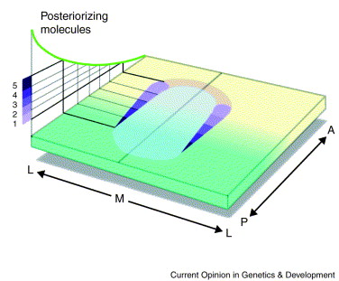 Fig. 3. Hypothetical model of anterior–posterior patterning of NC cells. The NC produces different populations of cells along the anterior–posterior axis, 1 being the most anterior and 5 the most posterior NC. Each of these cell types has a specific fate during development and originates from a specific location within the neural folds. We propose here that the antero-posterior differences of the NC are initiated early during development, at the neural plate stage, by posteriorizing signals (green curve) via a mechanism similar to that which distinguishes the prospective forebrain from the prospective NC cells. A, anterior; P, posterior; M, medio; L, lateral.