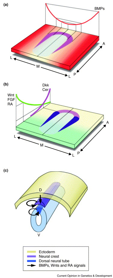 Fig. 2. A double gradient model of NC induction. (a) A medio-lateral gradient of BMPs (red) is established in the ectoderm, specifying the neural plate border as anterior neural fold (pale purple) at a threshold concentration. (b) Posteriorizing signals (green curve), which correspond to the activities of Wnts, FGFs and RA, transform the most posterior part of the neural plate border into prospective NC cells (dark purple). These signals are generated in a gradient-like manner, with higher levels in the posterior part of the ectoderm and lower levels in the anterior region. These lower levels are also kept low by anti-posteriorizing signals, such as Dickkopf and Cerberus (green curve), produced by the anterior region of the embryo. (c) Once the neural tube is closed, some of the initial inductive signals are expressed in dorsal regions of the embryo, such as the epidermis, the NC and the dorsal neural tube. These signals are required to maintain the specification of NC cells in a process known as the late step of NC induction. The expression of BMPs and Wnts has been described for this step and there is some evidence to suggest that RA is expressed in the hindbrain region, but no expression of this molecule has been reported in the NC. A, anterior; P, posterior; M, medio; L, lateral; D, dorsal; V, ventral.
