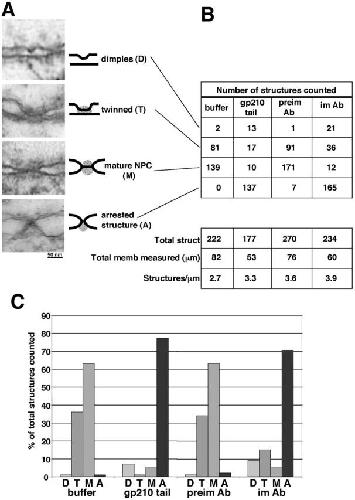 We tested the hypothesis that gp210, an integral membrane protein of nuclear pore complexes (NPCs), mediates nuclear pore formation. Gp210 has a large lumenal domain and small COOH-terminal tail exposed to the cytoplasm. We studied the exposed tail. We added recombinant tail polypeptides to Xenopus nuclear assembly extracts, or inhibited endogenous gp210 tails using anti-tail antibodies. Both strategies had no effect on the formation of fused flattened nuclear membranes, but blocked NPC assembly and nuclear growth. Inhibited nuclei accumulated gp210 and some nucleoporin p62, but failed to incorporate nup214/CAN, nup153, or nup98 and were defective for nuclear import of lamin B3. Scanning and transmission EM revealed a lack of "closely apposed" inner and outer membranes, and the accumulation of novel arrested structures including "mini-pores." We conclude that gp210 has early roles in nuclear pore formation, and that pore dilation is mediated by gp210 and its tail-binding partner(s). We propose that membrane fusion and pore dilation are coupled, acting as a mechanism to control nuclear pore size.