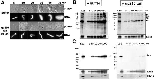 Interference with the cytoplasmic tail of gp210 disrupts "close apposition" of nuclear membranes and blocks nuclear pore dilation.