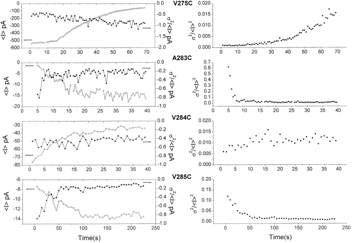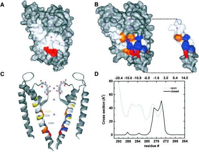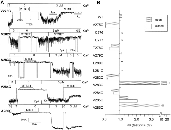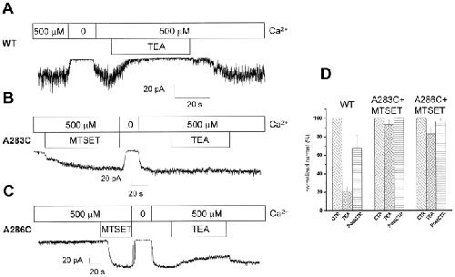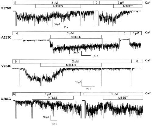Cysteine-scanning mutagenesis (SCAM) and computer-based modeling were used to investigate key structural features of the S6 transmembrane segment of the calcium-activated K(+) channel of intermediate conductance IKCa. Our SCAM results show that the interaction of [2-(trimethylammonium)ethyl] methanethiosulfonate bromide (MTSET) with cysteines engineered at positions 275, 278, and 282 leads to current inhibition. This effect was state dependent as MTSET appeared less effective at inhibiting IKCa in the closed (zero Ca(2+) conditions) than open state configuration. Our results also indicate that the last four residues in S6, from A283 to A286, are entirely exposed to water in open IKCa channels, whereas MTSET can still reach the 283C and 286C residues with IKCa maintained in a closed state configuration. Notably, the internal application of MTSET or sodium (2-sulfonatoethyl) methanethiosulfonate (MTSES) caused a strong Ca(2+)-dependent stimulation of the A283C, V285C, and A286C currents. However, in contrast to the wild-type IKCa, the MTSET-stimulated A283C and A286C currents appeared to be TEA insensitive, indicating that the MTSET binding at positions 283 and 286 impaired the access of TEA to the channel pore. Three-dimensional structural data were next generated through homology modeling using the KcsA structure as template. In accordance with the SCAM results, the three-dimensional models predict that the V275, T278, and V282 residues should be lining the channel pore. However, the pore dimensions derived for the A283-A286 region cannot account for the MTSET effect on the closed A283C and A286 mutants. Our results suggest that the S6 domain extending from V275 to V282 possesses features corresponding to the inner cavity region of KcsA, and that the COOH terminus end of S6, from A283 to A286, is more flexible than predicted on the basis of the closed KcsA crystallographic structure alone. According to this model, closure by the gate should occur at a point located between the T278 and V282 residues.