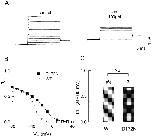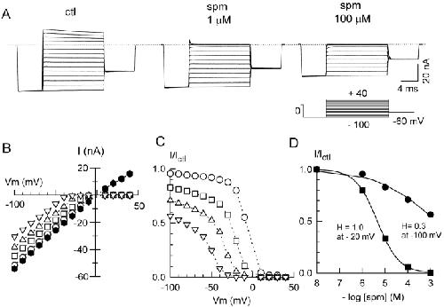 Figure 2. . Macroscopic I-V relationship for different concentration of spermine. (A) Representative current traces recorded from inside-out patch in the presence of 0 (control), 1, and 100 μM spermine. The dotted line indicates the zero current level. Voltage protocol is shown at the bottom. (B) Steady-state I-V curves for control (), and 1 μM (○), 10 μM (□), 100 μM (▵) and 1 mM (▿) spermine. (C) The ratio of the steady-state current (I) in the presence of spermine to that in its absence (Ictl) plotted against voltage, for the spermine concentrations in B (with corresponding symbols). (D) Comparison of the concentration dependence of the spermine block at −100 mV (•) and −20 mV (▪), respectively, from the experimental data in C. Solid lines are best fits to a Hill equation: I/Ictl = 1/(1 + ([spm]/Kd)H), where Kd is spermine concentration causing half-maximal block and H is the Hill coefficient. The values of H at −100 and −20 mV are as indicated. |