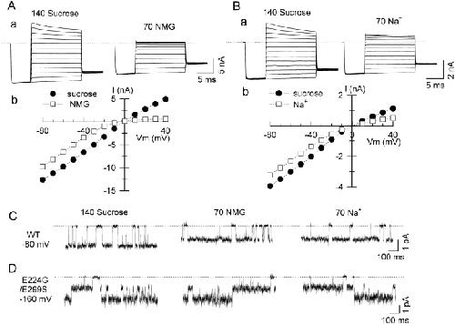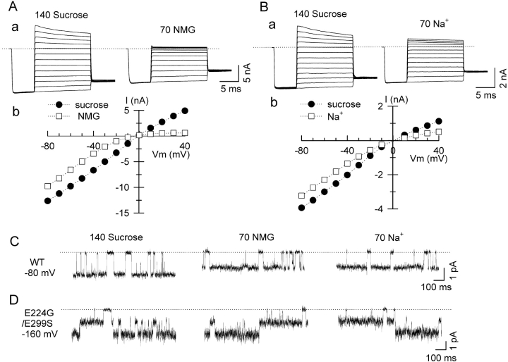 Figure 5. . Effects of ionic strength on wild-type and mutant Kir2.1 channel currents. Ionic strength was increased by replacing 140 mM sucrose with 70 mM NMG+ or 70mM Na+. (A and B) Macroscopic currents (a) of wild-type Kir2.1 channel were recorded with symmetrical 30 mM K in intracellular and extracellular solutions. The macroscopic I-V curves in the presence of sucrose vs. NMG+ or Na+ are shown in (b) in both panels. (C) Single channel recording from wild-type Kir2.1 under symmetrical 30 mM K+ conditions at holding potential of −80 mV. (D) Single channel recording of the double mutant channel E224G/E299S under the same condition at holding potential of − 160 mV. There were two channels in this patch. |
