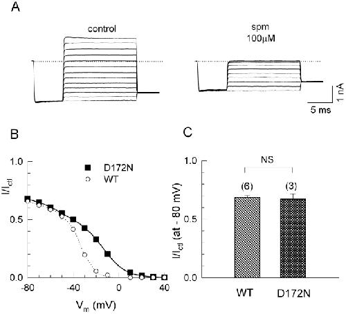 Figure 7. . Effect of neutralizing D172 on spermine block. (A) Representative macroscopic current recordings from oocytes expressing wild-type and D172N channels in the absence and presence of 100 μM spermine. (B) Ratio of the steady-state current in the presence of spermine (I) to that in its absence (Ictl) vs. voltage for WT (the same values as Fig. 6 B) and D172N. The smooth lines are fitted value to model 2 in Fig. 8 B. (C) Bar graph comparing the reduction in the currents at −80 mV by 100 μM spermine, in WT (n = 6), D172N (n = 3). |