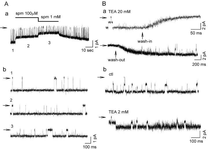 Figure 3. . Effect of spermine and TEA on Kir2.1 single channel currents, recorded from inside-out patches excised from COS7 cell transfected with Kir2.1 cDNA (holding potential of −60 mV). (A a) Application of 100 μM and 1 mM spermine reduced single channel amplitude. The continuous change of the single channel amplitude is particularly evident during the wash-out phase. The expanded traces in b, 1 and 2, are from the corresponding times in A a labeled 1, 2, and 3. (B) Blocking effect of TEA on single Kir2.1 channel currents. With 20 mM TEA, note the increase in open channel noise during the wash-in and washout of TEA (trace a). For 2 mM TEA (2 mM) at steady-state (trace b), the unitary amplitude is reduced but the open channel noise is increased. Zero current levels are indicated by horizontal arrows. |