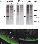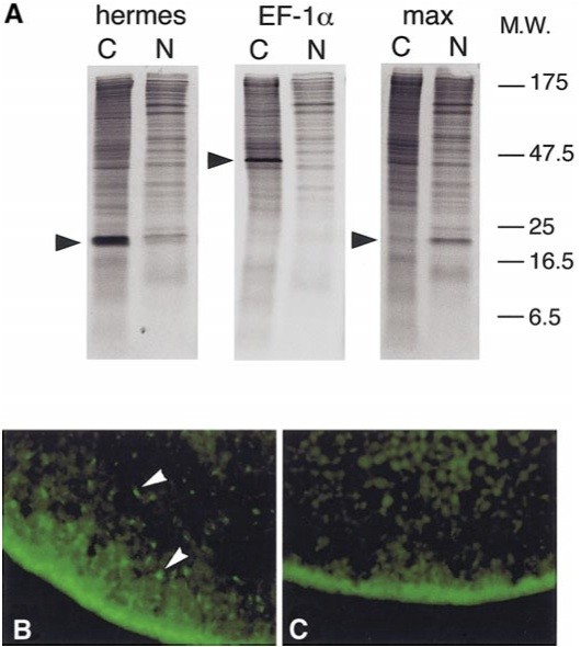 FIG. 2. Subcellular localization of hermes in the oocyte. (A) Hermes is present in both the nuclear and cytoplasmic compartments. Syn- thetic mRNAs encoding either hermes, the cytoplasmic protein EF-1alpha, or the nuclear protein Max were injected into the cytoplasm of Xenopus oocytes, together with [35S]methionine. Oocytes were manu- ally dissected into cytoplasmic (C) and nuclear (N) fractions. Protein extracts equivalent to one-fifth of each fraction from a single oocyte were resolved on SDS-PAGE and visualized by fluorography. Results indicate that the control proteins EF-1alpha and Max localize to the cytoplasmic and nuclear fractions, respectively. hermes is present primarily in the cytoplasm, but a small portion of hermes is found in the nuclear fraction. (B, C) Immunolocalization of epitope-tagged hermes protein in the oocyte. Synthetic mRNAs encoding myc- epitope-tagged proteins were injected into mature oocytes, and the resulting proteins were visualized by immunocytochemistry on sec- tioned oocytes. (B) View of the vegetal region of a MTHermes-injected oocyte. Staining appears as a punctate pattern. (C) View of the vegetal region of an oocyte expressing myc-epitope tag alone. Staining is diffuse and does not show the punctate pattern seen with MThermes.