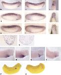 FIG. 5. Overexpression of hermes inhibits heart and kidney development. Embryos injected with mRNA encoding hermes and lineage tracer GFP, or GFP alone. All embryos are at stage 28/29, unless otherwise specified. Whole-mount in situ hybridizations are photographed as lateral views except for (C), (F), and (I), which are ventral views of the same embryos pictured laterally. (AâC) GFP-injected control embryos showing normal expression of cardiac alpha-actin in the somites (A, B) and paired heartprimordia (C). (DâF) Single-sided injections cause the ablation of the heart-forming region on the injected side (arrow) as assayed by cardiac alpha-actin. (GâI) Double-sided injections showing complete ablation of both heartprimordia, while somite morphology (G, H) is unperturbed as assayed by cardiac alphaactin. (J, K) Transverse sections through stage 32 embryos (linear heart tube stage) injected with GFP mRNA only (J) or bilaterally injected with hermes mRNA (K) and assayed by cardiac alpha-actin. Note the absence of any cardiac alpha-actin staining as well as the absence of a morphologically detectable heart tube in (K), although the heart tube is easily detectable in (J). (L, M) GATA-4 expression in control embryos (L) is indistinguishable from hermes-injected embryos (M). (N, O) By contrast, a hermes-injected embryo (O) has reduced Nkx2â5 expression compared with a control GFP-injected embryo (N). (P, Q) A stage 25 hermes-injected embryo assayed with the kidney marker X-pax2. The uninjected side (P) shows normal kidney expression, while the injected side (Q) shows the absence of all kidney expression.