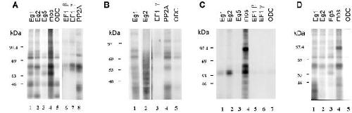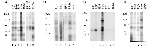 Figure 1. Comparative analysis of proteins that UV crosslink to Eg1, Eg2, Eg5 and c-mos 3'UTRs.32P-labeled transcripts corresponding to the 3' untranslated regions of the RNAs indicated above the lanes were incubated in extracts made from 4 hour (pre-transcription) Xenopus embryos, irradiated with UV light and digested with RNase A. The proteins rendered radioactive by crosslinking to the labeled transcripts were analysed by electrophoresis on 10% polyacrylamide-SDS gels followed by autoradiography. A32P-UTP labeled RNAs; B32P-ATP labeled RNAs; C32P-GTP labeled RNAs; D32P-CTP labeled RNAs. In each panel the sizes of the molecular weight markers are indicated on the left.